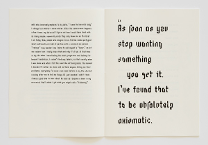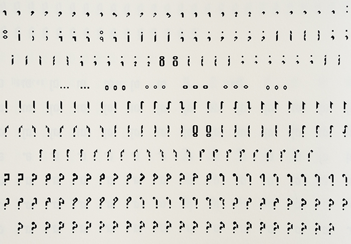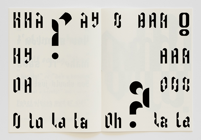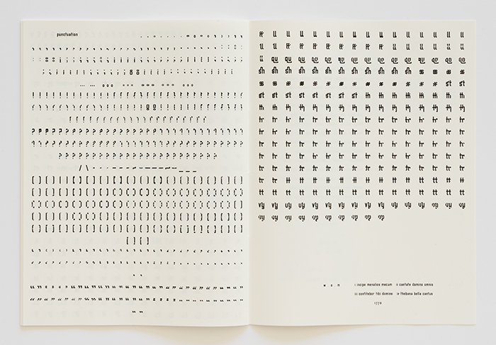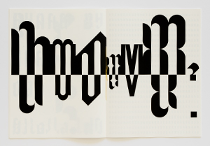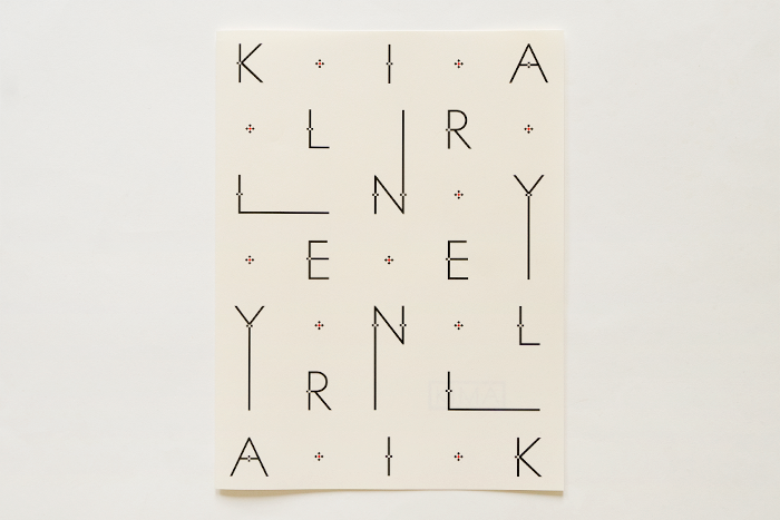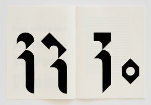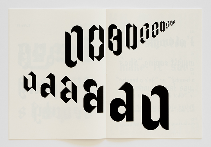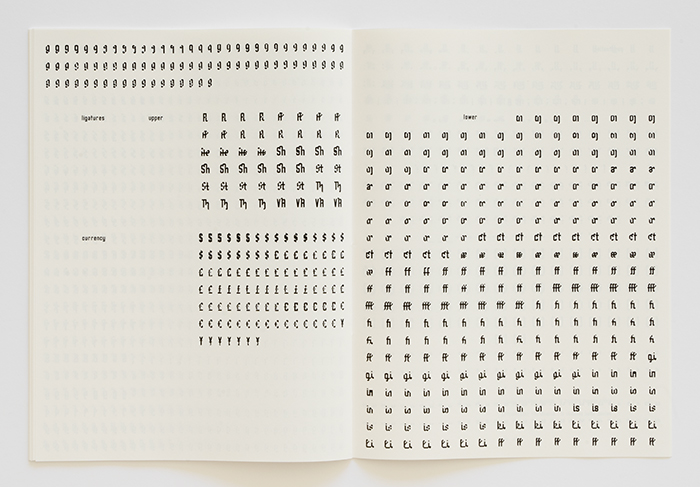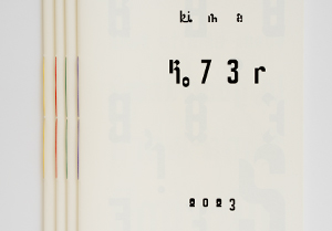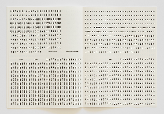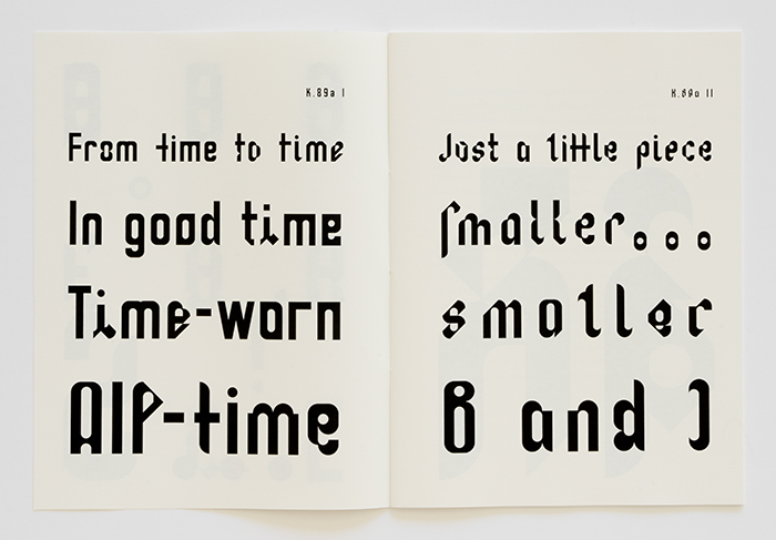 K.73r 2023 Started in February 2021, K.73r is a geometric sans type family in 5 styles. Continuing early Modernist exercises about modular typography, it is constructed of square, circle, triangle in counterpoint. Unlike those types, and as a working font file created a full century later, K.73r’s ultra-expansive type table is made up of 9,989 glyphs, with up to 100 alternates per character. K.73r is both functional and experimental. Its highly legible base style should interact with its stylistic counterparts to affirm the poetic and practical potential of all intelligently designed language. Edition of 30 44 pages 9 × 12 in Stitchbound digital print Order (USA) Order (Intl) Order (Intl tracking) Terms |