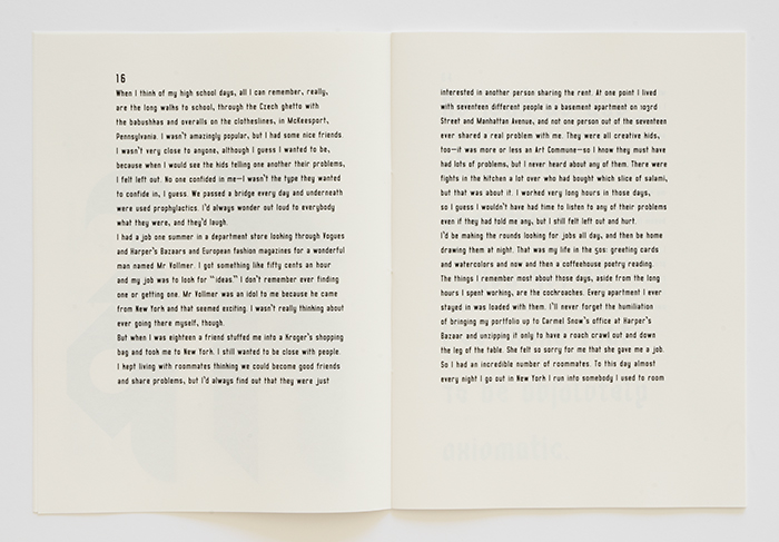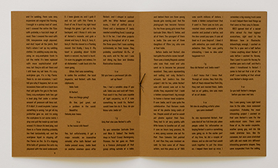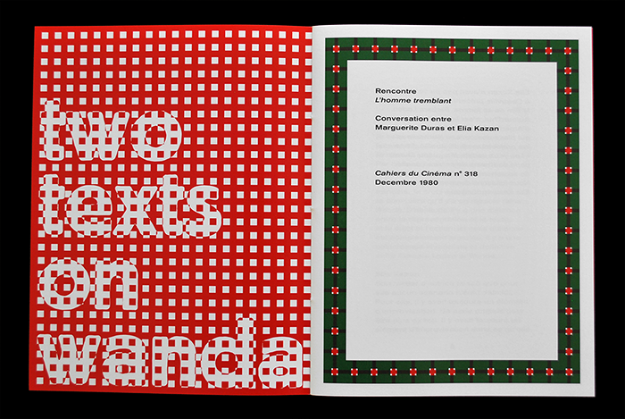 Two Texts on Wanda 2017 Edition of 15 36 pages 7.75 × 10.125 in Stitchbound digital print book with CAD poster jacket French and English Two texts on the film Wanda (1970) by Barbara Loden. Marguerite Duras and Elia Kazan in conversation, Cahiers du Cinéma, December 1980. Stéphane Delorme on Wanda, Cahiers du Cinéma, July–August 2003. |