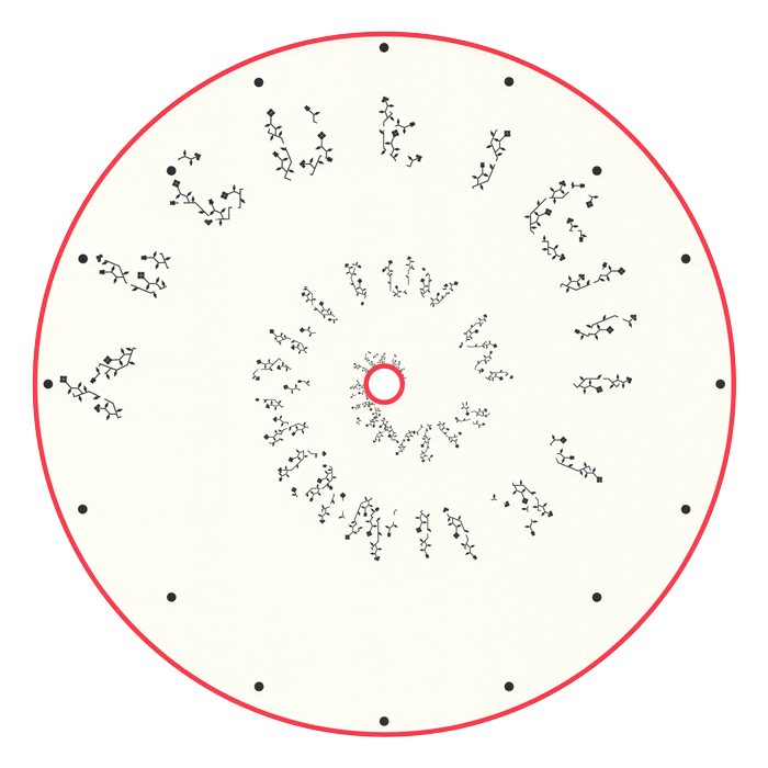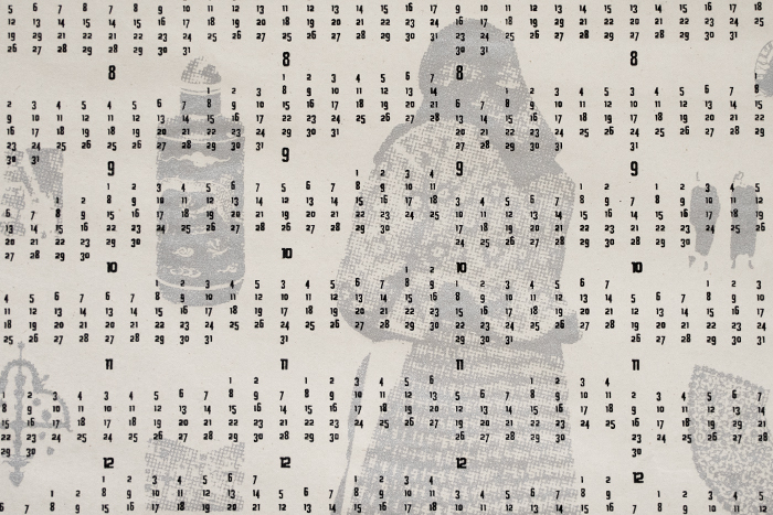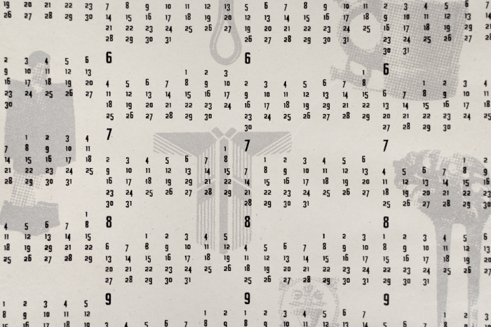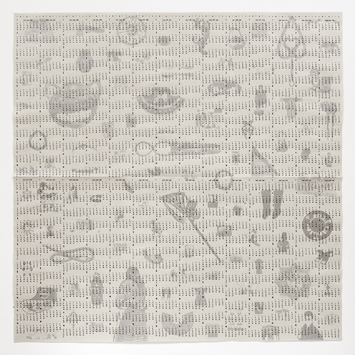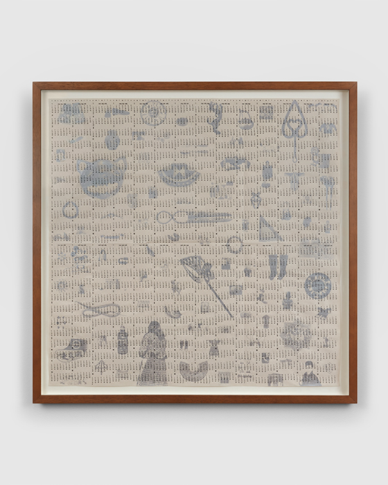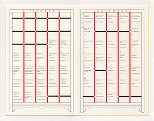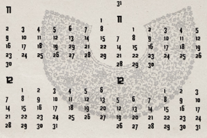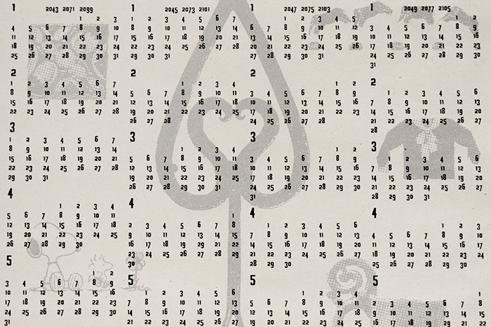 Cultural History 2023 Edition of 40 28 × 28 in flat 9.5 × 14 in folded Silver and black 2-color silkscreen on newsprint 28-year perpetual calendar set in K.73r. Order (USA) Order (Intl) Order (Intl tracking) Terms |