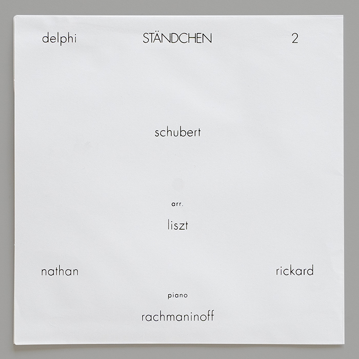 Delphi 2 2024 Edition of 25 + 4 AP 7” flexi disc 45 rpm Hand silkscreen and watercolor on paper sleeve, each unique Cover artwork by Nathan Rickard Franz Schubert, Ständchen, arrangement for piano by Franz Liszt, played by Sergei Rachmaninoff. Order (USA) Order (Intl) Order (Intl tracking) Terms |