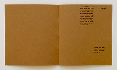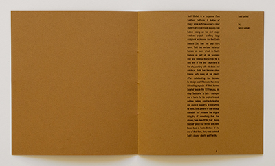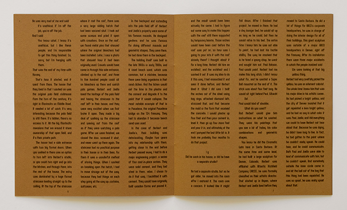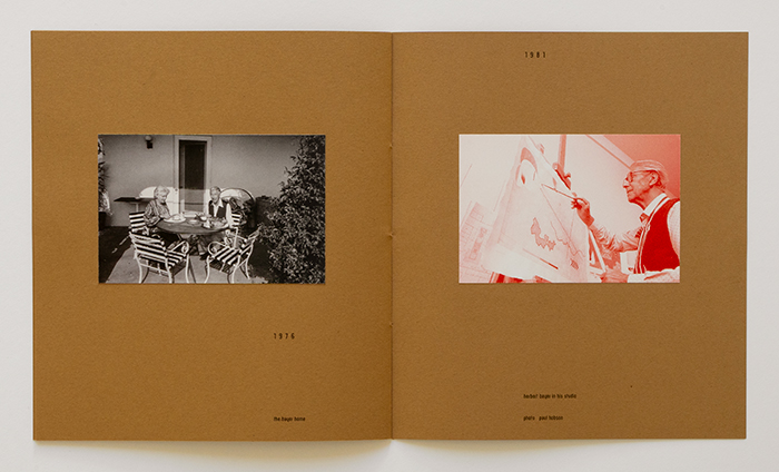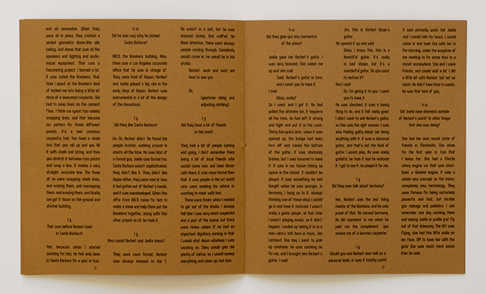 Herbert & Joella Bayer According to Todd Weikel 2024 Edition of 30 20 pages 7 × 8 in Stitchbound digital offset with tipped-in plates Interview with Santa Barbara carpenter Todd Weikel on working for artist and Bauhaus master Herbert Bayer and his wife and business partner Joella Bayer at their home in Montecito during the last years of their lives. Introduction by his son, Henry Weikel; interview conducted on June 1, 2024 by Henry and myself. Order (USA) Order (Intl) Order (Intl tracking) Terms |