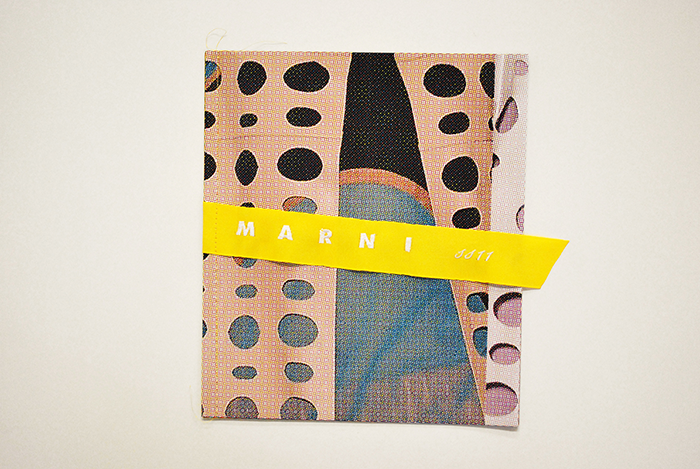 Marni ss11 2013 Edition of 10 24 pages 9.5 × 11 in Stitchbound digital print with custom embroidered ribbon Images from Marni Spring/Summer 2011 |