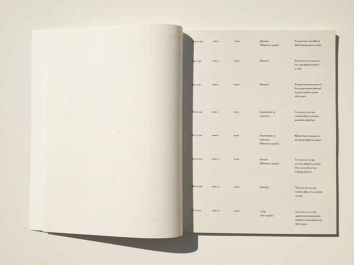 Animals and Man in Space 2014 Edition of 10 40 pages 8.5 × 10 in Inkjet print and acetone transfer Text from US naval report; images of Laika and Belka, Soviet space dogs |