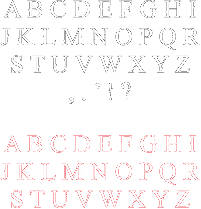 Killarney 2021 Edition of 25 26 pages 8 × 11 in Digital print in handmade encasing Typographic specimen of custom drawn decorative capitals with ornamentation based on the floral patterning of Killarney inlaid wood furniture. Order (USA) Order (Intl) Order (Intl tracking) Terms |