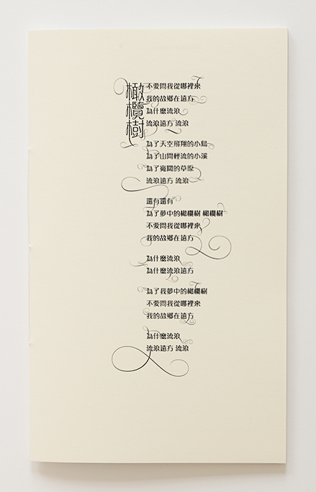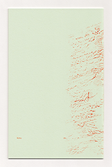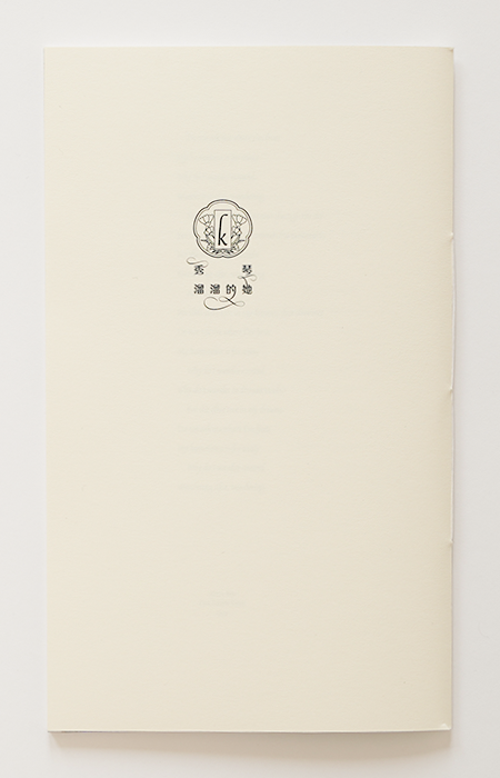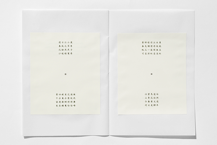 Jueju 2016 Edition of 10 12 pages 6.5 × 9.5 in Tipped-in digital prints on rice paper, stitchbound Poetry by Du Fu, Chengdu, 759–765 |