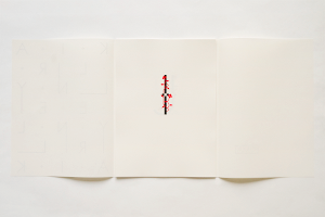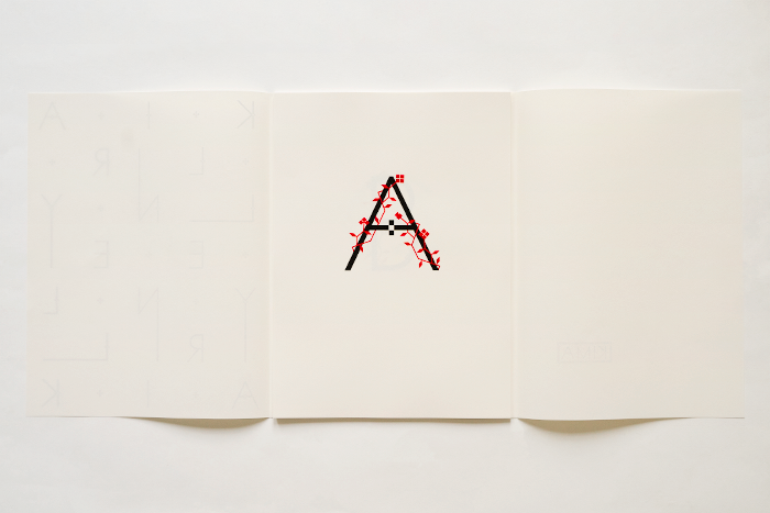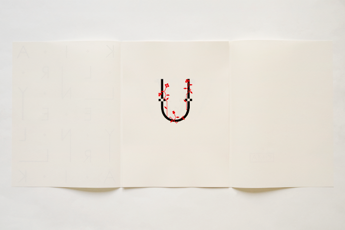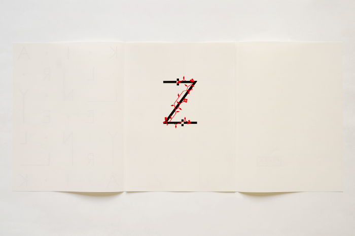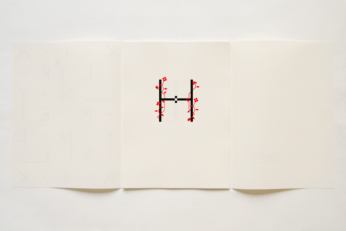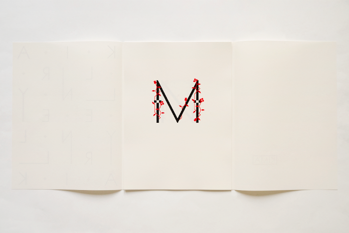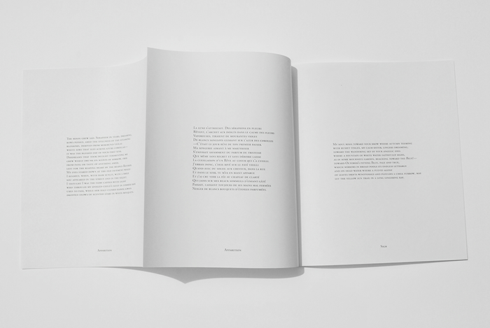For Ann Demeulemeester 2014 Edition of 15 6 pages 10 × 12 in (folded) 60 × 12 in (flat) CAD print and hand silkscreen French and English Poetry by Stéphane Mallarmé |
