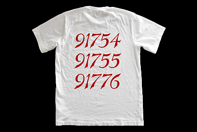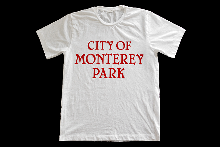 Monterey Park 2017 Edition of 20 Cotton t-shirt US medium & large only Hand silkscreen Originally designed by Harsh Patel in 2006 for Raymond Tseng’s store Lion’s Den. Cities was a series of shirts marking Chinese suburbs in greater LA. They were given to friends and family. The original colorway was yellow and black. |