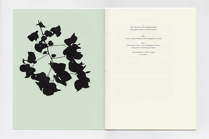 Anna Magdalena Bach 2018 Edition of 15 20 pages 6.5 × 8.5 in Stitchbound digital print The Chronicle of Anna Magdalena Bach, Jean-Marie Straub and Danièle Huillet, 1968. “Anna Magdalena as Bach’s Copyist,” Yo Tomita, 2007. |
