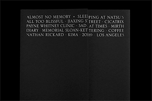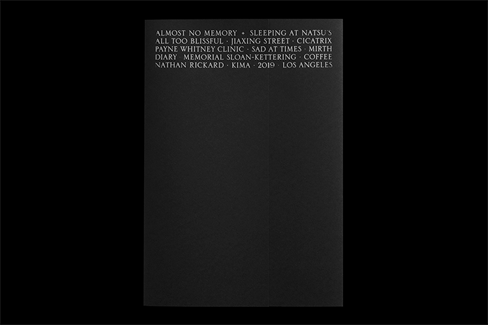 Almost No Memory 2019 Edition of 12 + 4 AP 8.5 × 12.5 in Digital offset prints in hand silkscreened portfolio 9 digital offset prints (8 × 12 in) 1 newsprint poster (12 × 16 in) Photographs by Nathan Rickard taken in Los Angeles and Taiwan |