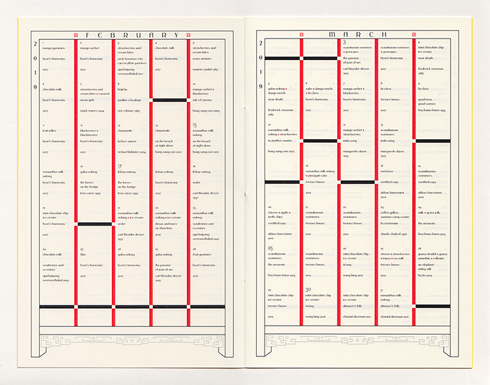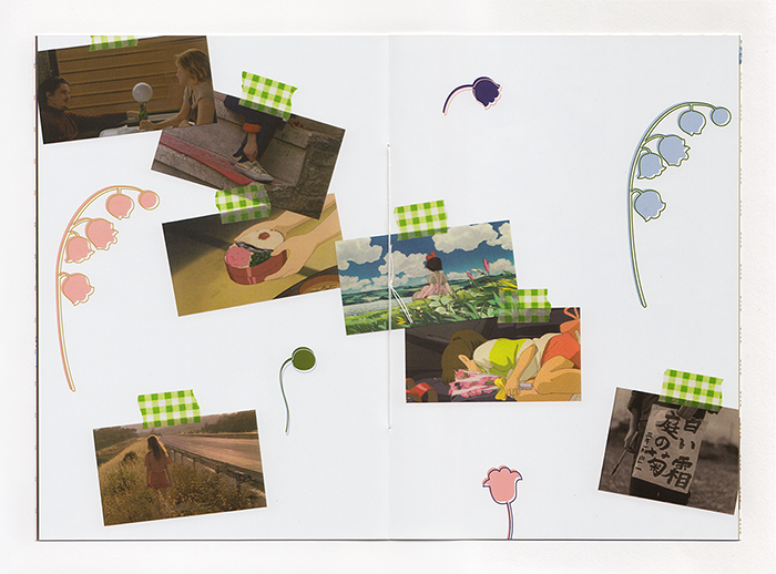 Places to Visit 2020 Edition of 24 12 pages 6.5 × 10.125 in book 12 × 7.5 in poster Stitchbound digital print with newsprint poster insert 2019 in movies and snacks. Poster still from Hong Sang-soo’s Grass, 2018. |