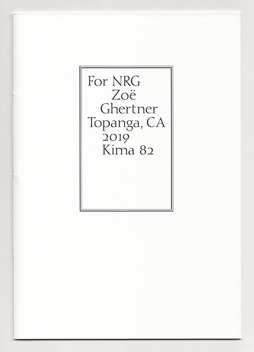 For NRG 2019 Edition of 50 + 10 AP 28 pages 7 × 10 in Stitchbound digital print with glassine endsheets Photographs by Zoë Ghertner |