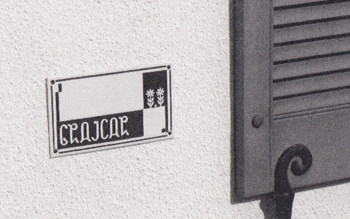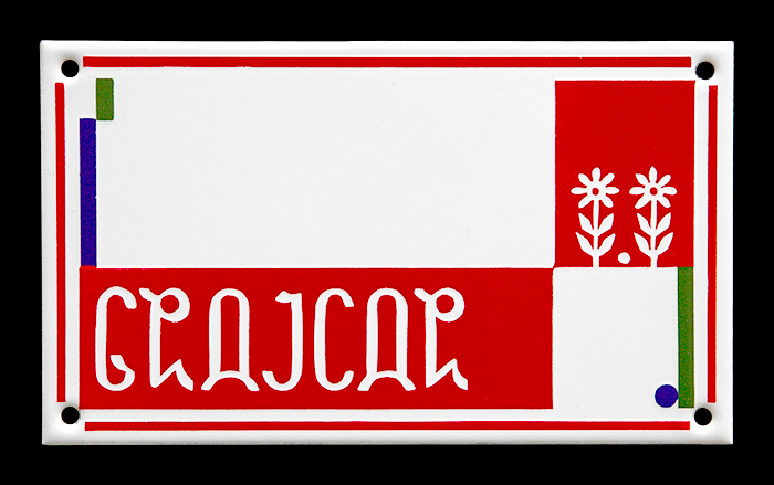 Ulice před domem 2020 Edition of 3 7 × 4 in Enamel nameplate My grandfather’s original Slovak last name in custom drawn type after the work of Martin Benka (b. 1888, Kostolište, Slovakia). Made in the Czech Republic. |