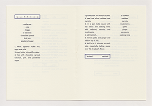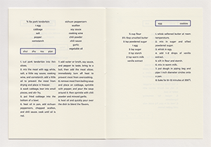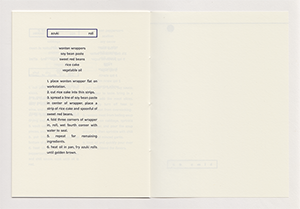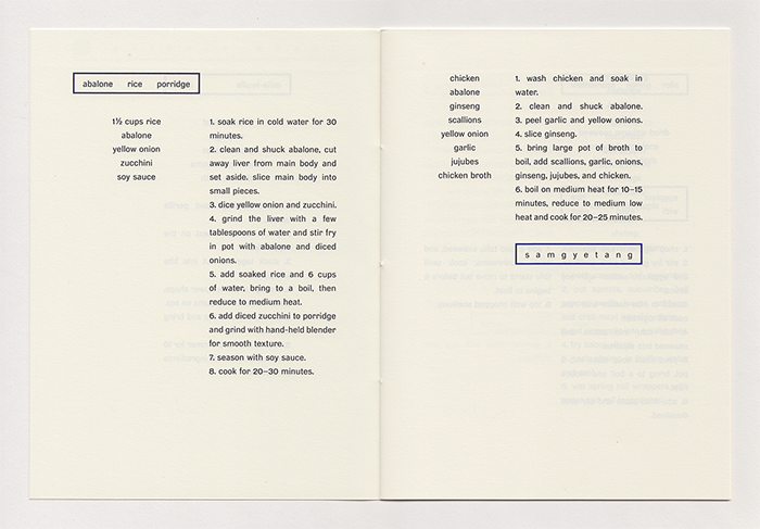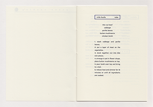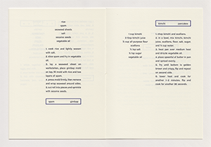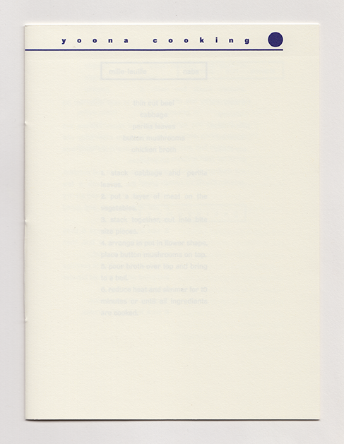 Yoona Cooking 2020 Edition of 25 20 pages 6 × 8 in Stitchbound digital print Recipes from Yoona of Girls’ Generation compiled from Hyori’s Homestay, her 2016 Chongqing fan meeting, and Weibo. |