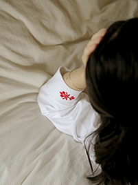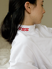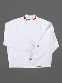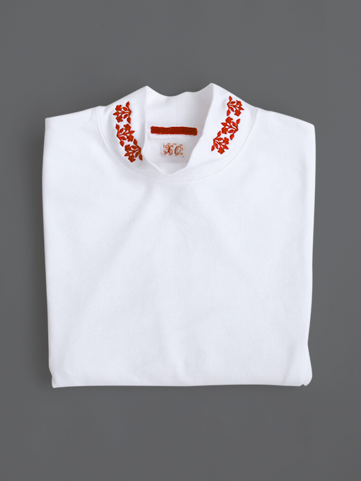 Kroj 2020 Edition of 7 Cotton mock neck shirt US medium only Custom embroidery Ornamentation drawn from the Hawaii State Public Library System motif. Clothing tags include section of traditional Slovak kroj ribbon made in the Czech Republic. |