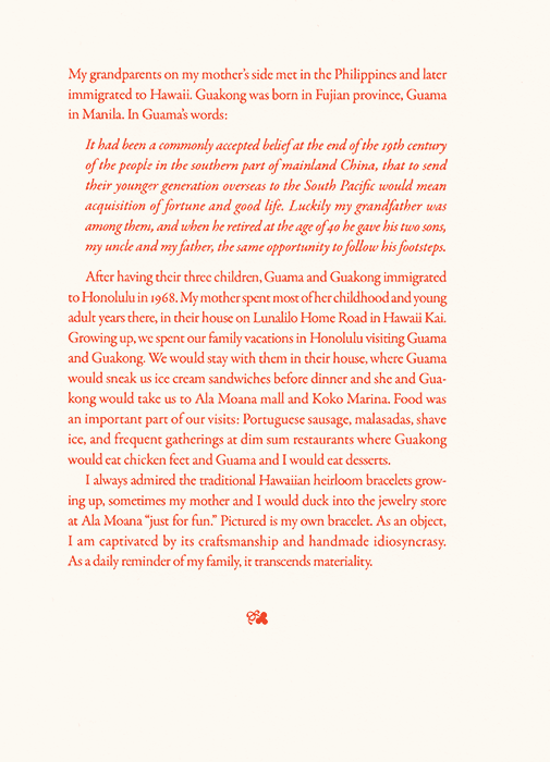 Hawaii of China 2015 Edition of 35 24 pages 8 × 10 in Stitchbound digital print with tipped-in photograph Text by Jeannette Graycar (stories by my mother of growing up in the Philippines and Hawaii) |