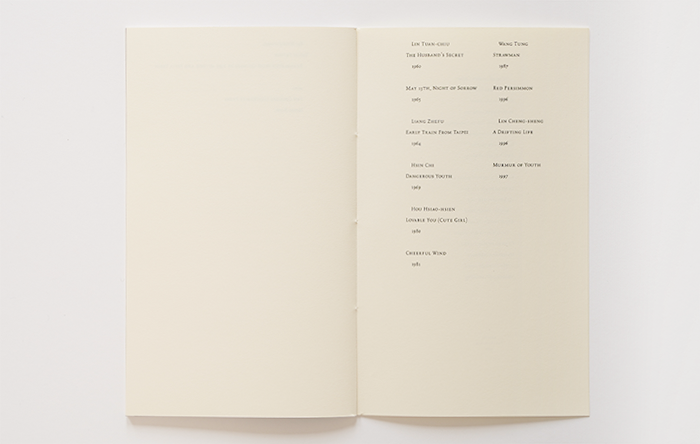 Lovable You 2021 Edition of 20 64 pages 5.25 × 8.75 in Stitchbound digital print with foldout plates Stories from Pai Hsien-yung’s Taipei People (2000, The Chinese University Press). Film stills from Lin Tuan-chiu, Liang Zhefu, Hsin Chi, Hou Hsiao-hsien, Wang Tung, and Lin Cheng-sheng. |
